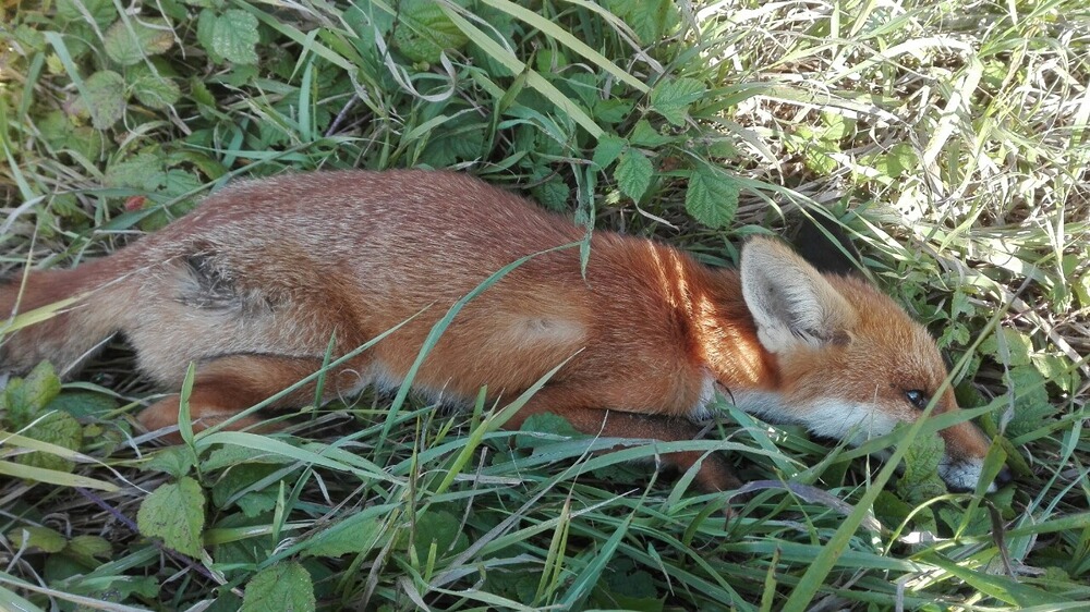 Als diese "Arbeiten" erledigt waren, war es viertel vor fünf. Da ich noch Zeit hatte, habe ich mich dann sozusagen spontan mit meiner KK-Büchse auf den neuen Sitz gesetzt. Wobei ich nicht wirklich mit Anblick gerechnet habe, nachdem ich da ja erst lautstark rumgewerkelt hatte. Aber wie der Zufall es will, viertel nach fünf streckte ein Jungfuchs (nicht der von den Fotos) den Kopf aus einem Brombeerdickicht. Er ging noch zwei Schritte, sicherte und sank dann von einer Kugel getroffen zu Boden.