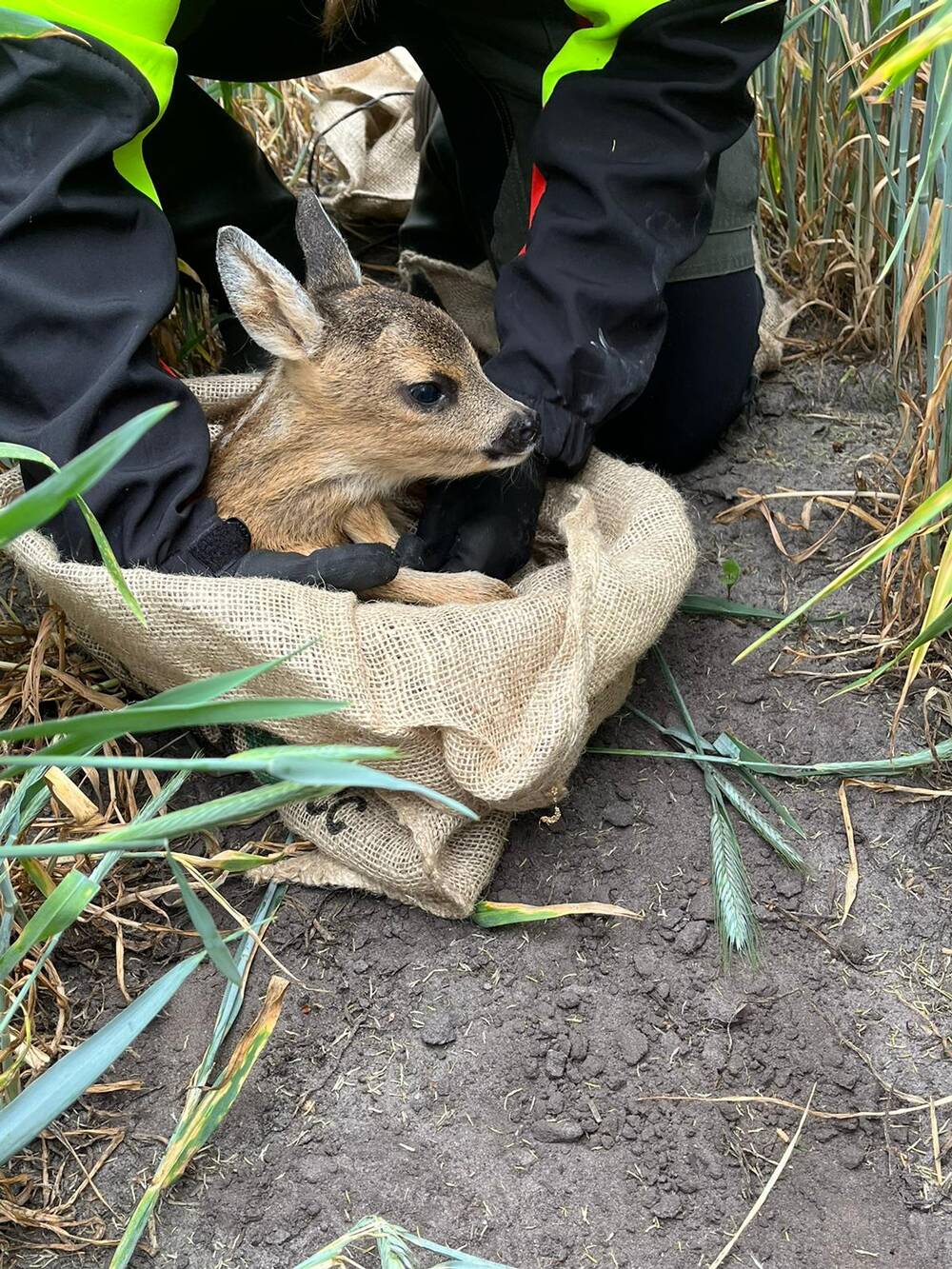 Mit einer anderen Drohnenpilotin zusammen habe ich mir das Abfliegen einmal geteilt. Als Sie die Drohne flog, war ich ihre Helferin und durfte nach dem Auffinden des Kitzes selber los in die Fläche. Langsam pirschten wir uns voran, die Drohnenposition immer im Blick. An der Position angekommen, lag da das kleine Kitz. Schnell den Kescher drüber zum Sichern, dann das kleine Wesen vorsichtig in den Sack umgelagert. Als wir mit den Köpfen wieder über das hohe Gras schauen konnten, kam da die Ricke laut schimpfend auf uns zu, um Ihr Kitz zu verteidigen. Das hatte ich vorher auch noch nie so erlebt. Die Ricke bleib die gesamte Zeit in der Nähe und als wir das Kitz nach dem Mähen im angrenzenden Getreide frei gelassen haben, konnten wir miterleben, wie Ricke und Kitz wieder zueinander fanden.
