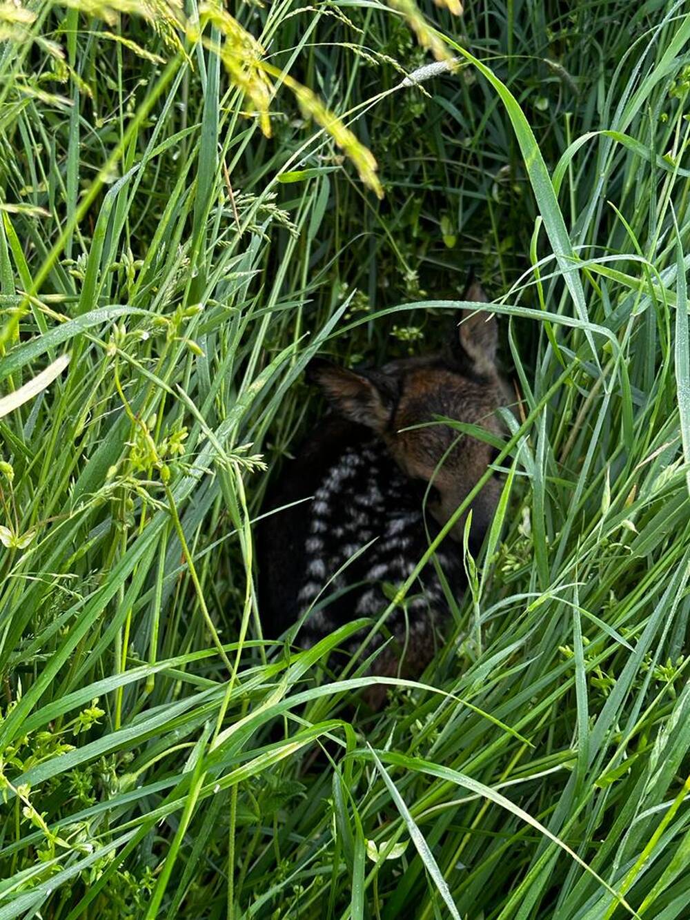 Aus diesem Grund sind wir erst diese Saison am Start. Nach einigen Einsätzen ohne Funde, konnten wir am vergangenen Samstag die ersten Kitze, und zwar sechs Stück, aufspüren und aus der Gefahrenzone in Sicherheit bringen. Da wir eine große Fläche abfliegen mussten mit vielen verstreuten Wiesen, starteten wir die Drohne um 4.30 Uhr und fanden das erste Kitz um 4.47 Uhr. Dank vieler helfender Hände, hierfür ein großes Dankeschön an mein Helferteam, konnte das Kitz schnell in einem Karton an den schützenden Rand verbracht werden.
