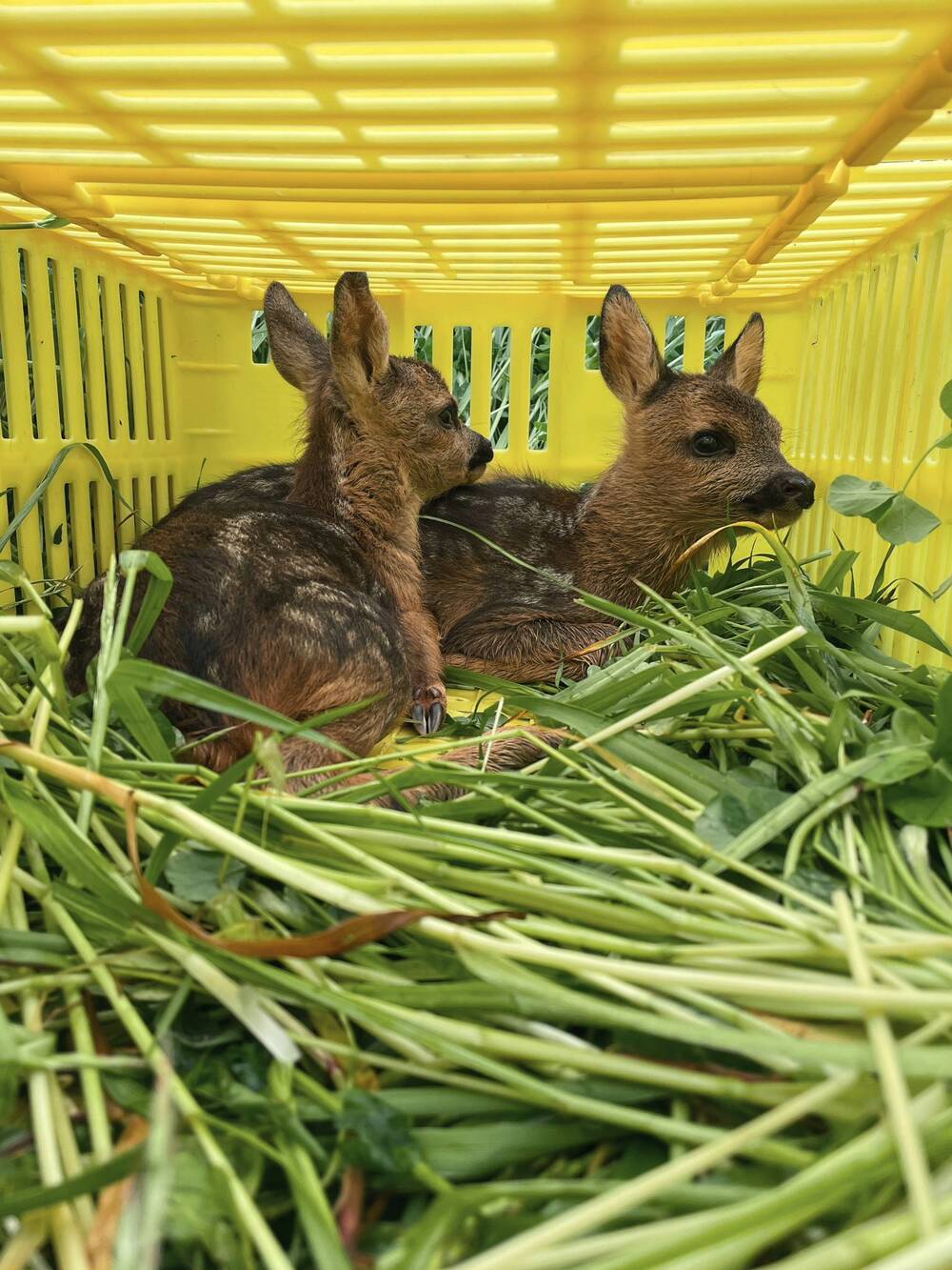 Um viertel vor vier Uhr morgens klingelt der Wecker. „Es ist besser, bei diesen Temperaturen bereits um halb fünf im Feld anzufangen“, entscheiden wir, damit die Wärmebildkamera unserer Drohne auch zuverlässig anzeigt. Heute haben wir knapp 20 Hektar auf 7 Flächen verteilt abzufliegen. Ausgestattet mit der Drohne, Körben zur Sicherung der Kitze, Walkie Talkies und natürlich Handschuhen geht es dann zum Einsatzort. Pilot und Co-Pilot (mit Zweitbildschirm) bedienen die Drohne, ein bis zwei (manchmal gibt es auch mehr fleißige Helfer ;-)) andere Personen unseres Teams stehen mit den Körben parat im Feld, die sich mit der Drohne mit bewegen, um schnellstmöglich am Fundort zu sein, wenn es soweit ist. Und dann kommt der Moment, durch den das frühe Aufstehen verziehen ist, das den Arbeitstag im Büro recht lang macht: Die Drohne zeigt einen starken Wärmepunkt an, wir fliegen tiefer herab und stellen auf Normalkamera um. Ein Kitz :-D!! Über die Walkie Talkies kommunizieren wir mit den Läufern, die sich bereits fertig machen, um das Kitz aus der Wiese zu entnehmen. Mit übergestreiften Handschuhen und abgezupften Gras in der Hand nehmen sie das Kitz behutsam auf und legen es in einen Korb (oben verriegelbar), um es zu einem z.B. von Getreide geschützten Ort neben dem Feld zu transportieren. In dem zusätzlich mit Gras bedeckten Korb wartet Bambi auf seine Freilassung nach der Mahd. Am nächsten Morgen ist es immer schön festzustellen, dass die Ricken ihre Kitze abgeholt haben.
