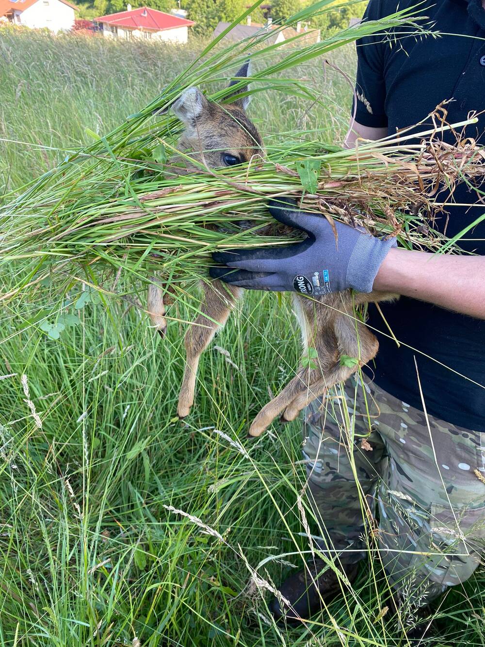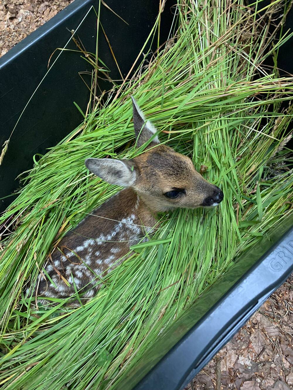Pünktlich um 5 Uhr stieg die feuerwehrrote DJI Mavic Enterprise dann über der ersten Wiese auf und wurde auch nach kurzem Suchen direkt fündig - ein Rotwildkalb lag im hohen Gras. Dem Kalb haben wir uns langsam genähert, haben es dadurch auf die Läufe gebracht, sodass es sich selbst im angrenzenden Bestand in Sicherheit bringen konnte. Es folgten noch drei weitere Rotwildkälber, die sich ebenfalls selbststänig aus der Wiese in den Bestand zurückzogen und ein Rehkitz, welches mit Handschuhen und einer guten Menge Gras vorsichtig von der Wiese unter große Bäume in den kühlen Schatten gelegt wurde und mit einem Korb bedeckt daraus wartete, bis das Mähwerk seinen Dienst verrichtet hatte. Ein besonders schöner Anblick, den wir aus einiger Entfernung miterleben durften, war die Ricke, die ihr unversehrtes Kitz wieder in Empfang nehmen konnte.