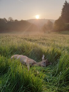 Am ersten Mai galt es dem Reh und Rotwild, als es in der Morgendämmerung nicht mit dem Schmaltier klappen wollte entschieden wir uns nochmal durch das Tal Richtung Dorf zu pirschen wo wir am Abend zuvor einen Sprung Rehe ausmachen konnten. Wir liefen los immer still und leise die Sinne geschärft mit der aufgehenden Sonne im Gesicht. An der Schafkoppel angekommen wurden diese schon leicht nervös und wir hofften auf wieder eintretende Ruhe. Der Wind stand gut so pirschten wir weiter Richtung der Talwiese. Plötzlich nahmen wir Bewegung war, Rehwild! Wir krochen auf allen 4ren auf dem Asphaltweg Richtung Hecke am Rande der Wiese. Ich ausgestattet mit Fernglas und selbstgebautem Schießstock und mein Jagdfreund mit seiner Büchse. An der Hecke angekommen mussten wir erst mal selektieren, ein 2-3 jähriger Bock, ein knopfbock der ständig von seinem Rivalen vertrieben wurde und eine hochträchtige Ricke! War da nicht gestern noch ein Stück dabei ?! Wir entschieden uns langsam fertig zu machen und auf den Knopfbock zu waidwerken. Es ging ständig hin und her der ältere Bock hat unseren Knopfbock immer wieder vertrieben, weg war er .. wir haben schon fast mit nichts mehr gerechnet, bis unser Bock auf 70 Meter wieder aus dem schwarzdorn austrat und abseits stand. Ich zog mir den Gehörschutz auf und sprach zu meinem Freund wenn er bereit steht kannst du fliegen lassen, ich habe kaum ausgesprochen durschlug der Knall schon das stille Tal und der Bock lag im knall. Waidmannsheil mein Freund???? es freut mich mindestens genauso sehr wenn Freunde strecke machen wie ich selbst. Aber gemeinsam waidwerken ist immer wieder besonders und bleibt im Gedächtnis! Wir warteten noch 10 Minuten und gingen zum Stück wo ich ihm dann den letzten Bissen und den Erlegerbruch überreichen konnte.