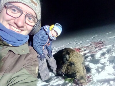 Da drehte sich die Sau leicht und er konnte einen sauberen Schuss auf die Kammer abgeben. Man bin ich bei dem Knall erschrocken. Nun hat mir Papa erstmal erklärt, dass man nicht spitz auf ein Tier schiesst und man warten muss bis es breit steht.