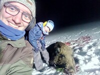 Es war ein starker Keiler, der ca 70kg gewogen hat. Getreu nach dem Motto ,,Nach dem Schuss kommt die Arbeit" habe ich ihm noch tatkräftig beim aufbrechen geholfen. Auch meine beiden kleineren Geschwister sind noch mit Taschenlampen bewaffnet aus dem Haus gekommen, da es ja erst 20.15 Uhr war. Demnächst kochen wir noch die Keilerwaffen aus und präpariern sie auf ein Holzbrett.