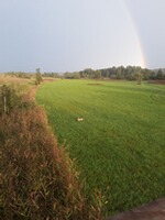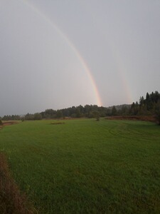 Wie schon befürchtet kam der Gewitterregen bei uns vorbei und für kurze Zeit dachte man das war´s dann jetzt mit dem Ansitz. So schnell wie der Regen kam verzog er sich auch schon wieder und mit dem schwindenden Regen zeigte sich auch noch ein wunderschöner Regenbogen. Mit den letzten Regentropfen kam es dann auch schon zum ersten Anblick des Abends: Meister Reineke zog direkt an meiner Kanzel vorbei und sorgte so für eine erheiternde Ablenkung.
