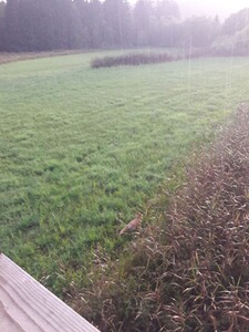 Nachdem sich der erste Gast von der Bühne verabschiedet hatte und ich nichts ahnend die Landschaft beäugte zeigte sich plötzlich ein Stück Schalenwild am vor mir liegenden Waldrand. Mein erster Gedanke: es muss bestimmt ein Reh sein. Ich griff nach meinem Fernglas und merkte schnell; es ist doch ein Rotwildkalb. Doch wo ist das dazugehörige Alttier fragte ich mich? Diese Frage beantwortete sich nach kurzer Zeit von selbst. Nach kurzer Zeit legte sich das Rotkalb wieder ins hohe Gras vor dem Wald ab wo es mit seiner Mutter auch schon gelegen sein muss als ich auf die Kanzel stieg. Nach längerem beobachten des Kalbes, von welchem nur das Haupt im hohen Gras leicht erkennbar war, muss ich aus Unachtsamkeit gegen die Schusslatte geraten sein. Ruuummmmppsss machte es in der geschlossenen Kanzel und siehe da, Alttier und Kalb standen am Waldrand da. Nach meiner nicht sehr sinnigen Aktion in der Kanzel dachte ich mir das war´s dann jetzt mit dem Rotwild. Das Alttier sicherte noch eine Zeit lang die Gegend ab und zog mit seinem Kalb anschließend den Waldrand entlang…natürlich wegwärts von mir. Kopfschüttelnd saß ich auf meiner Kanzel und dachte mir nur: gut gemacht!