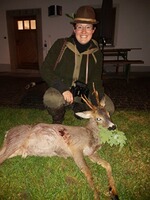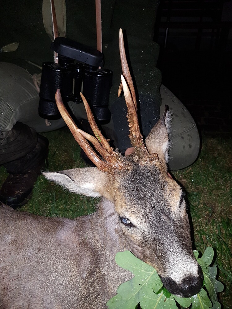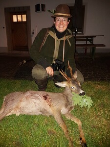 Und so ging ich sehr oft, auf diesen einen Bock! Und dann eines Abends, um kurz vor 21 Uhr, trat erst ein Schmalreh aus der Dickung und dicht gefolgt der lang ersehnte Bock! Er blieb direkt vor meinem Sitz stehen und sicherte zu mir herauf. Mein Herz ging so schnell und laut, ich traute mich kaum zu atmen! Als der Bock seine Aufmerlsamkeit wieder auf das Schmalreh richtete und er dann schussgerecht stand, lies ich mit ruhiger Hand, die Kugel fliegen!