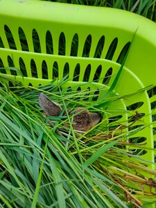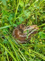Aber nun zum Erlebnis. Als Landwirt(-in) und Jäger(-in) kennt man seine Ecken, an denen Betrieb ist und so flog mein Freund die Drohne und ich wartete, bis was zu sehen war, um es zu holen und sicher unter einem Wäschekorb zu verstauen. Als die Kamera eine Wärmequelle anzeigte, gingen wir durch die Bauchhohe Luzerne. Irgendwann blieb mein Freund stehen, damit nicht noch mehr Wasser in seine Gummistiefel lief. Ich mit meiner Schürze tat mich da leichter und er navigierte mich zu dem Kitz. Ich legte es mit Handschuhen und einem großen Büschel Luzerne in den Wäschekorb und bedeckte es mit etwas frischer Luzerne. Es war so klein. Ich ging zu meinem Freund zurück, der immer noch im Feld stand und weiter mit der Drohne die Luzerne abflog. Nach ein paar Minuten sagter es: "Schau mal neben uns." Tatsächlich. Keinen Meter neben uns lag das Geschwisterchen. Gut versteckt in der hohen Luzerne. Und wir wären fast drübergelaufe und haben es nicht gesehen.
