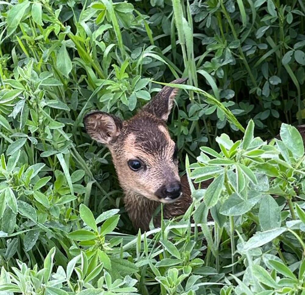 Unter den 16 Kitzen waren 4 Zwillingspärchen. Drei Pärchen waren bereits so mobil, dass eine Vorort-Sicherung mit Kiste nicht sinnvoll gewesen wäre. Deshalb haben wir die kleinen, aber bereits flinken Geschöpfe langsam und vorsichtig in einen angrenzenden Wald getrieben, wo bereits die Mama rief.