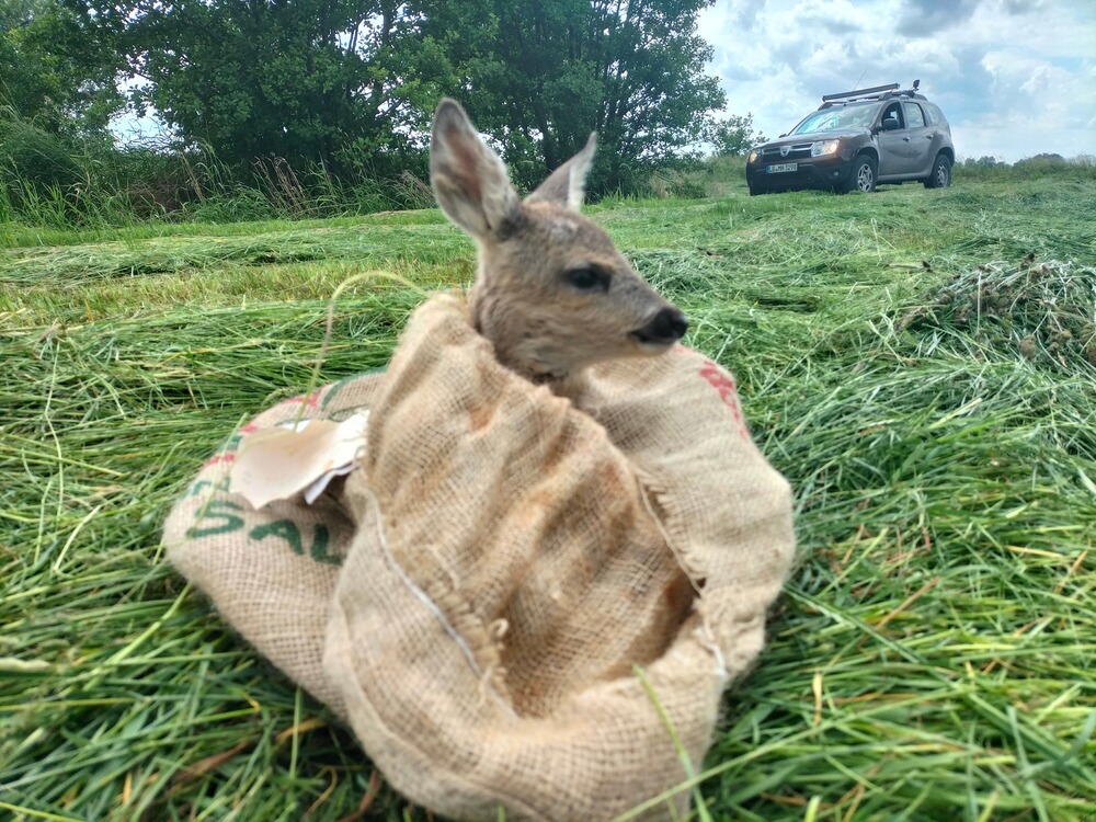 Wenn die Kitze mit der Drohne gefunden wurden, werden sie bis die Mähwerke durch sind, in Jutesäcken gesichert und so schnell wie möglich wieder frei gelassen. Was natürlich nur durch unsere gute Zusammenarbeit durch Jäger, Landwirt und Helfern möglich ist. So konnten dieses Jahr schon 12 Kitze auf einer Fläche von ca. 200ha gesichert werden !