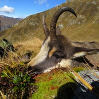 Zu meinem 18. Geburtstag habe ich von meinen Eltern eine Jagdreise geschenkt bekommen. Es ging nach Südtirol in die Zillertaler Alpen. Das Ziel, ein Gamsbock. Nachdem wir mittags am Ferienhaus angekommen waren , welches schon mitten im Jagdgebiet lag, konnten wir schon bei einer kleinen Wanderung am Nachmittag die ersten Gämse im Hang beobachten. Voller Vorfreude ging es nun am nächsten morgen bei Sonnenaufgang los. Während des Aufstiegs konnten wir schon einige Gämse entdecken, aber es war noch nicht passendes dabei. Aus einiger Entfernung konnten wir sehen, dass sich einige Gämse unterhalb des Bergkamms standen. Also machten wir ein Plan und pirschten langsam, geschützt von Felsvorsprüngen und vereinzelten Latschen, den Bergkamm entgegen. Als wir auf ca. 150 m an die Gämse heran gekommen waren, machten wir uns hinter einem kleinem Erdhügel fertig. In der Zwischenzeit hatte sich die passende Gams auf einem Felsenvorsprung niedergetan. Also hieß es warten. Da die Sonne die Gipfel noch nicht erreicht hatte, war es immer noch sehr kalt. Nach gut 20 Minuten stand der Gamsbock auf und zog mit einer weiteren Gams zügig auf uns zu. Als der Bock kurz verhoffte, konnte ich ihn mit der 9,3x62 mit einem sauberen Schuss an den Boden bannen. Er rutsche noch 10 m den Hang hinunter und blieb liegen. Da lag er nun. Mein erster Gamsbock. Bei näherer Betrachtung stellte sich sogar heraus, dass das Gehörn der Gams abnorm war. Der letzte Bissen durfte natürlich auch nicht fehlen und unser Jagdführer verbließ die Gams auf dem Berg. Ein unglaubliches Erlebnis, dass ich sicher nie mehr vergessen werde.