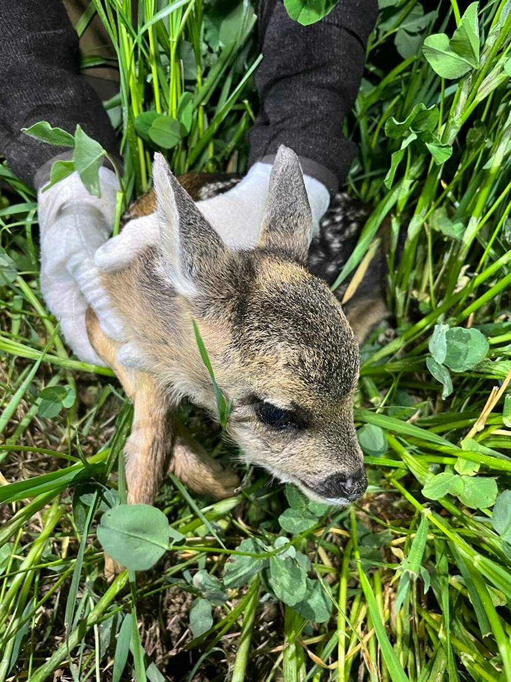 Im Rahmen der Kitzrettung haben wir im Mai Kitze vor dem Mähtod mittels Wärmebilddrohnen gerettet. Wir retteten gegen 6 Uhr morgens 2 Geschwisterkitze aus einer Wiese und hatten sie in einer Box am nahe gelegenen Waldrand verstaut. Ca 2 h später kamen wir zufällig noch einmal an besagter Wiese vorbei und der Landwirt wollte schon mit dem Mähen beginnen, als wir feststellen mussten, dass jemand die Box geöffnet, und die Kitze wieder in die “Freiheit” entlassen hatte. Kurzerhand mussten wir den Landwirt bitten noch nicht mit dem Mähen zu beginnen, da sich die Kitze vermutlich wieder in der Wiese befanden. Wir organisierten gezwungenerweise den Drohnenpiloten erneut, der sich schon auf dem nach Hause Weg befand und flogen die Wiese erneut ab. Da inzwischen die Sonne schien und sich die Wiese stark erhitzt hatte, war es nur sehr schwer möglich die Kitze in der Wiese auszumachen. Zum Glück fanden wir die beiden Kitze ca 10m voneinander entfernt in der Wiese liegen! Wir fingen die beiden ein und verstauten sie erneut in der Kiste bis der Landwirt die Fläche gemäht hatte. Zum Glück konnten wir die Geschwister vor dem Mähtod bewahren.