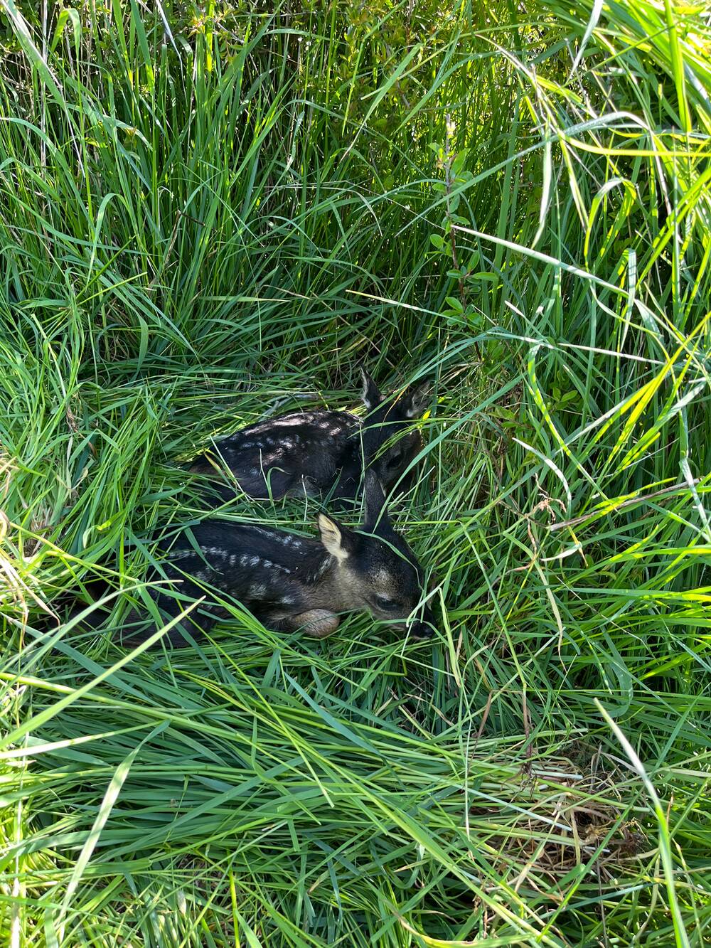 Nach kurzer Zeit kam der erste Funk: Da ist was. Also ging es direkt los – rein ins Feld, an die markierte Stelle. Und tatsächlich: zwei kleine Rehkitze, ganz nah beieinander, gerade mal ein paar Tage alt. Sie lagen reglos im Gras, wie es ihre Natur ist, um nicht aufzufallen.
