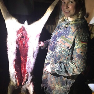 Mein Vater und ich waren zusammen auf Ansitz. Nach etwa einer Stunde Äste ein Reh nicht weit von uns entfernt. Kurze Zeit nachdem wir es bemerkt hatten  der Schuss. Mein Vater war sich sicher, dass er getroffen hat, doch das Tier hechtete den Abhang hinunter. Ich ging es suchen und fand es schließlich, nach langer Erkundung, unter einem Baum liegend. Es war das erste Reh, welchem ich so nah kam. Als ich es hochheben wollte, griff ich direkt in die Ausschusswunde. Ich wollte wieder hoch zu meinem Vater, aber der Hang war zu steil und zu nass. Also riefen wir uns zu, dass mein Vater mich mit dem Auto holen würde und ich einfach geradeaus laufen sollte. Gesagt getan. Ich trug das Reh wie ein Baby auf dem Arm, da ich es wegen vielen Baumstämmen so schlecht schleifen konnte. Ich hatte keine Taschenlampe - es war stockdunkel und dann fing es auch noch an zu schneien. Nach anstrengenden 500m habe ich weit unter mir, meinen Vater gesehen. Als ich diesen Hang auch noch hinunter bin, fuhren wir zur Hütte, brachen es auf und zuhause gab es dann die leckere Leber.