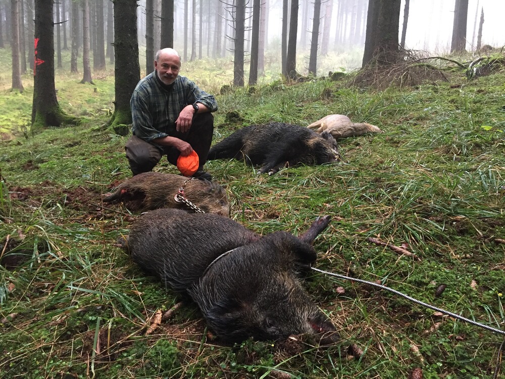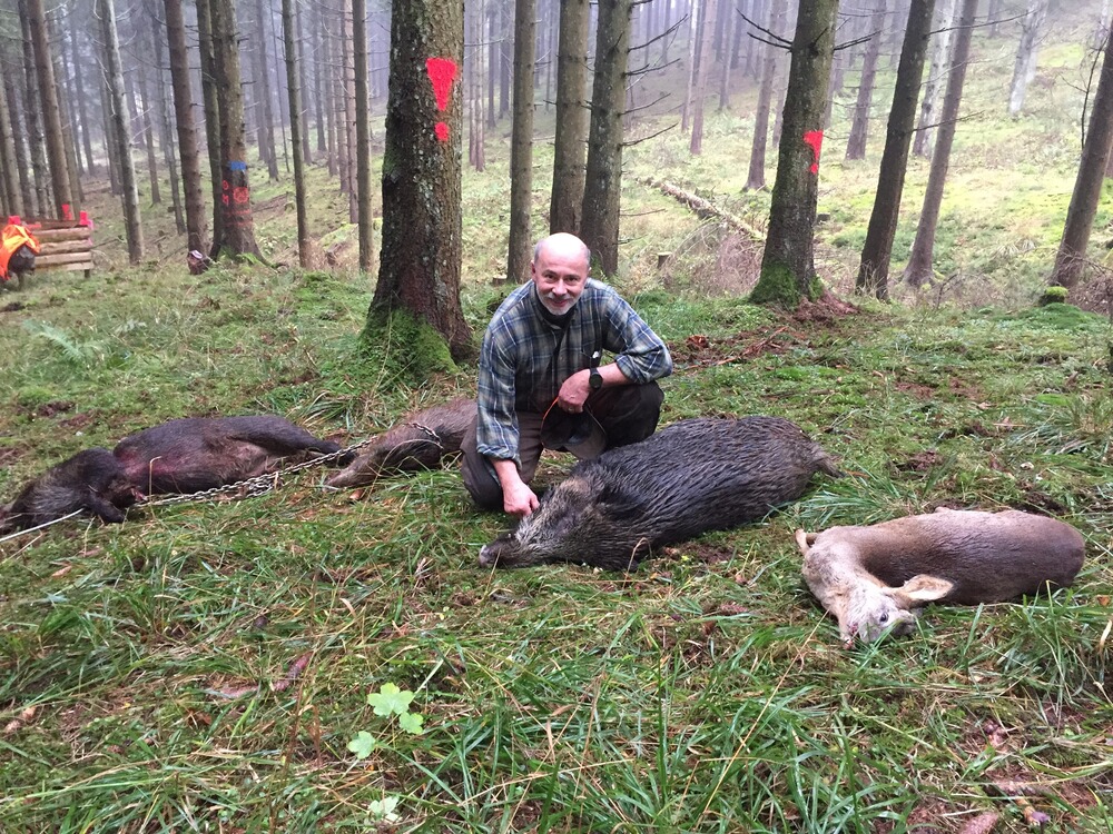 Was für ein Jagdtag. Nach etlichen Drück- bzw. Waldschutzjagden in den letzten Wochen mal wieder im Staatsforst Dauner Wald. Während es in Süddeutschland schon schneit, wird die Eifel von Dauernieselregen heimgesucht. Also bestes Sauenwetter. Wir beziehen im Morgennebel als Vierergruppe unsere Stände im lichten Hochwald, vor uns eine Senke mit Graben und gutem Blick auf den gegenüberliegenden Steilhang. Vom Forstamt wie immer gut vorbereitet. Jetzt ist Warten angesagt. Die Hunde sind schon unterwegs und geben fleißig Laut. Erste Bewegungen sind spürbar. Da wechseln auch die ersten Rehe durch, zu weit und schnell für einen guten Schuss. Ein Schmaltier kommt hochflüchtig durch die Senke. 4 Rehe ziehen zügig von links nach rechts, das hinterste Kitz verhofft ganz kurz und äugt zu mir herüber. Ich lasse mir diese Gelegenheit nicht entgehen, Waffe anbacken, Schuss aufs Blatt, es liegt im Knall. Repetieren, so ein Mist, die Patrone klemmt. Nochmal, Hülse später einsammeln. Klappt. Mein Standnachbar übernimmt das zweite Kitz, das auf seiner Höhe ebenfalls kurz verhofft. Es springt in meine Richtung und verendet im Graben vor mir. Sauber.
