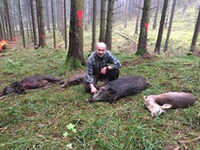 Es wird kälter, der Nieselregen dringt durch die Handschuhe, klamme Finger. Die Optik beschlägt, reinigen, von Nässe freihalten, immer bereit sein. Über eine Stunde später, gerade will ich Handschuhe wechseln, Bewegung im Gegenhang. Weit oben über die Kuppe kommt hochflüchtig eine starke Rotte. Schnell, die Leitbache vorneweg, Überläufer, Frischlinge, das ganze Programm. Bloß nicht nervös werden. Leichter gesagt als getan. Rechter Handschuh weg, Waffe hoch, entsichern. Ohje, welche nur, es sind so viele. Entfernung 70-80m, viel zu viele Bäume hier. Der 5te Überläufer, mitziehen, Schuss in die 1m breite Baumlücke - Treffer, liegt. Der nächste, wieder von links nach rechts mitziehen, etwas tiefer am Hang, Schuss, und wieder wird die Wutz an den Ort gebannt. Repetieren, was geht noch, die meisten sind durch und wieder über die Kuppe ausgewechselt. Da klagt es laut herüber, ein Frischling versucht mühsam Anschluss an die Rotte zu halten. Er schont, kämpft sich hinter den Fichten vorwärts. Kaum taucht er dahinter wieder auf, trage ich ihm meine Kugel an und das Klagen hört auf.