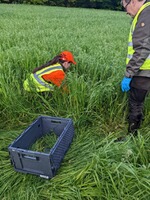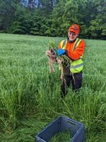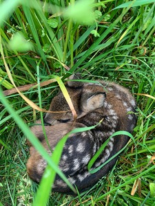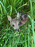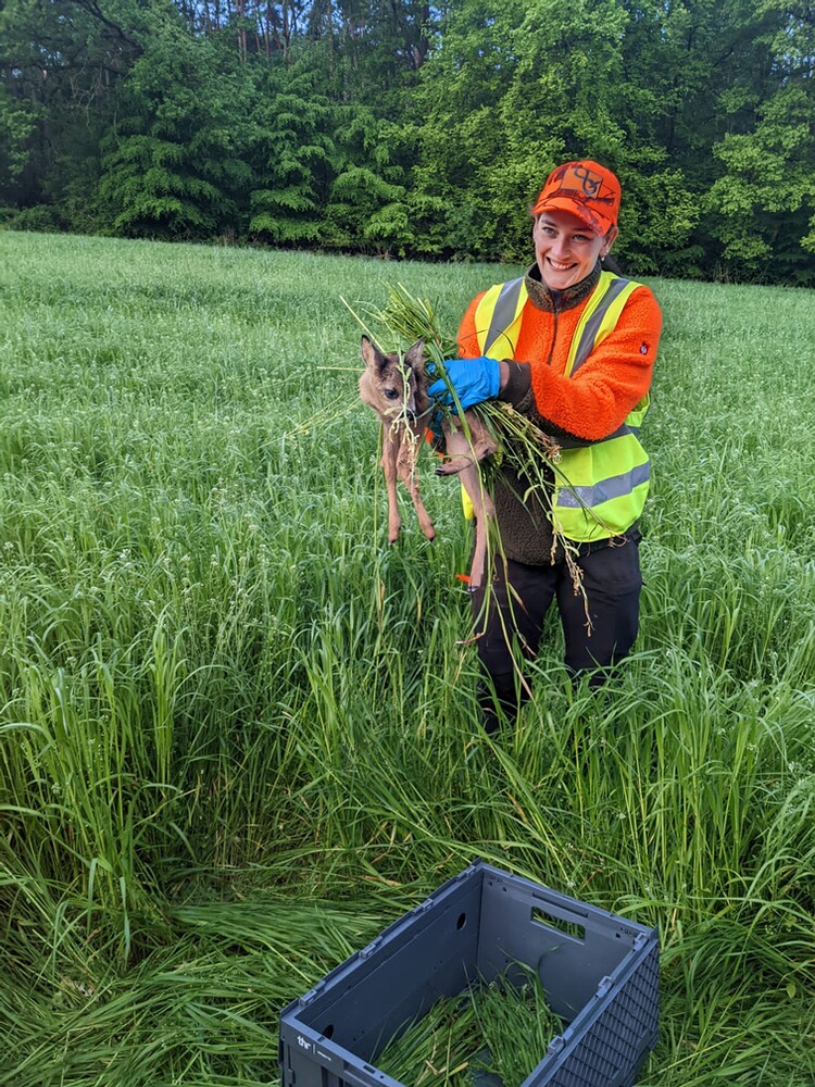 Ich bin Larissa, 23 Jahre alt und Studentin aus Haltern am See. Im April diesen Jahres habe ich den Jagdschein bestanden. Da ich die einzige Jägerin in der Familie bin, habe ich nicht die besten Möglichkeiten jagdlichen Anschluss zu finden. Durch die Kreisjägerschaft und den Hegering Haltern am See habe ich dann von der Kitzrettung erfahren. Die Zusammenarbeit mit Landwirten und Jägern gefällt mir sehr gut. Ich habe mich schon riesig gefreut die kleinen Kitze zu sehen und sie vor dem Mähen zu retten. Bei der Kitzrettung kann ich jagdliche Erfahrungen sammeln und von den erfahreneren Jägern weiter lernen. Bisher hatte ich noch nie ein Kitz gesehen. Der Hegering Haltern hat drei Drohnen mit Wärmebildkameras zur Verfügung gestellt bekommen. Nach einem ersten Treffen mit allen Helfern und Piloten, ging es dann endlich früh morgens los. Ich durfte bei gelb aufleuchtenden Signaturen die Stellen absuchen. Bei den ersten Suchaufträgen haben wir Rehwild und Junghasen sehen können. Durch die Signaturen konnten wir gut üben und den Ablauf kennenlernen. Kitze fanden wir allerdings noch nicht. Als ich am 12 Mai dann wieder dabei war, haben wir die ersten Felder im Wald abgesucht und der Erfolg blieb aus. Dann sind wir noch zu einem anderen letzten Feld angrenzend an den Wald und weitere Felder gefahren. Direkt leuchtete eine gelbe Fläche auf der Kamera auf. Wir liefen zu zweit mit Walkie-Talkies, Handschuhen und einer Kiste ausgestattet zu der Stelle. Plötzlich sprang eine Ricke auf und flüchtete in den Bestand. Wir dachten uns, dass ein Kitz in der Nähe sein konnte! Beim Abfliegen des Feldes sah der Pilot nichts und gab uns ein Zeichen zurück zu kommen. Wir waren fertig für den Morgen.... Plötzlich rief unser Pilot: "Halt, da vorne könne noch etwas ganz kleines sein!" Wir dachten uns, es ist bestimmt eine Maus oder ein Junghase. Mit der Erwartung, dass es bei unserer Annäherung flüchten würde, traten wir an die Signatur heran. Und da war es! Das erste Kitz, was ich in meinem Jägerleben sehen durfte! Das hat mich und alle Helfer so sehr gefreut, dass wir lachten und uns beglückwünschten! Ich durfte das Kitz vorsichtig berühren und in eine Box setzten. Kurz danach fanden wir noch ein Kitz im selben Feld, obwohl wir doch schon abbrechen wollten. An diesem Morgen wurden nach dem Mähen zwei kerngesunde, wunderschöne Kitze zurück gesetzt und waren bereit von den Ricken wieder angenommen zu werden. Ein wundervoller Tag und ein sehr erfüllendes Gefühl! Ich hoffe, es werden noch viele weitere Kitze vor dem Tod bewahrt und bin gespannt auf alle weiteren Erfahrungen, die ich als Jägerin erleben darf. Waidmannsheil! Larissa