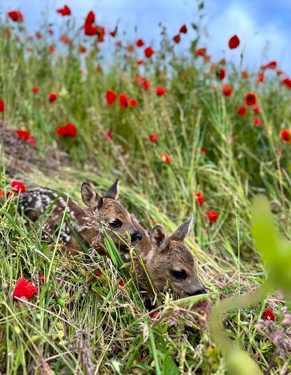 Unsere Foto-Galerie spricht Bände: Da liegt ein Kitz im Mohnfeld wie in einem Disney-Film (Bild 2), eins blinzelt uns mit Kulleraugen an und scheint zu sagen: “Hab ich was verpasst?” (Bild 1), und ein weiteres wird stilecht mit Drohnen-Backup in Sicherheit getragen (Bild 3).