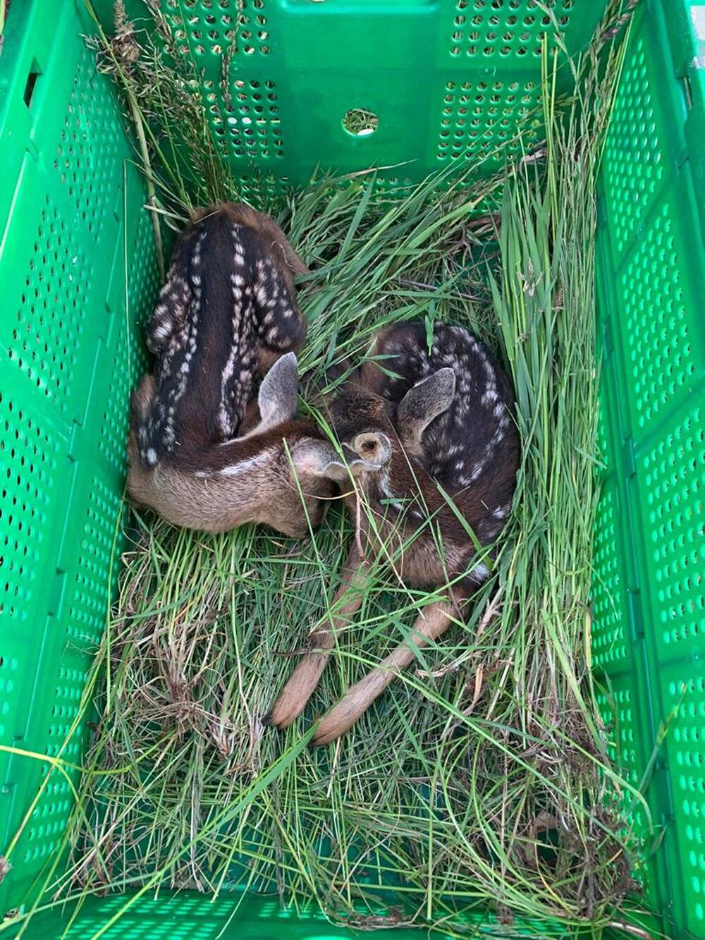 Er meldet sein Kommen per Funk an und wir bereiten eine unserer Kitzkisten vor. Als wir ihn kommen sehen, wie er in den Händen mit Handschuhen und Gras das Kitz trägt, klattschen Andreas und ich uns ab. Klasse, so ein Glück.. Das Kitz ist sehr schwach, das sehen wir sofort.