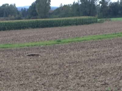 Letzter Schuss - ich überholte die vorher verfehlte Sau, welche nun bestimmt schon auf ca. 80 Meter Entfernung breit auf das zweite Maisfeld zu rannte. Halbe Sau vorhalten sagte die Stimme wieder. Und wirklich, sauber ins Getriebe getroffen. Meine Sau bremste abrupt mit dem Wurf nach vorne.