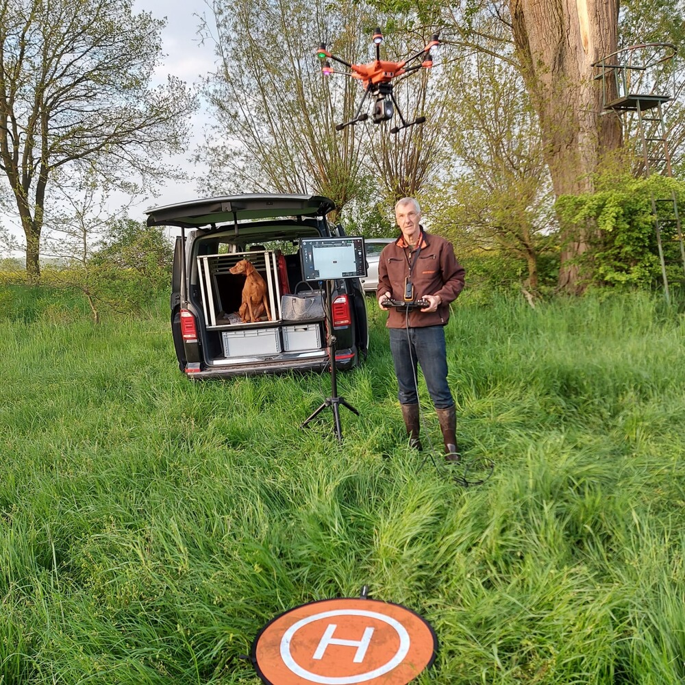 Auf geht?s, die Straßen sind noch wenig befahren. Schnell ist der Treffpunkt gefunden. Etwas Nebel schwebt über den Wiesen. Der Jagdpächter ist bereits mit einem Helfer vor Ort. Nach einer kurzen Einweisung wird Drohne und Steuerung startbereit gemacht. Die erste Wiese mit allen benötigten Flugdaten wird in der Steuerung programmiert und auf die Drohne hochgeladen. Die „Läufer“ sind auf Position und die Drohne hebt ab, geht auf 50m und fliegt ihre Mission Bahn für Bahn im Modus Autopilot wie geplant ab. Sobald eine Wärmesignatur auf dem Display zu sehen ist, wird manuell gesteuert. Ein Läufer wird mittels Funkgerät zu der Stelle geleitet, um die Lage zu erkunden, und ggf. das Kitz unter dem Korb zu sichern.