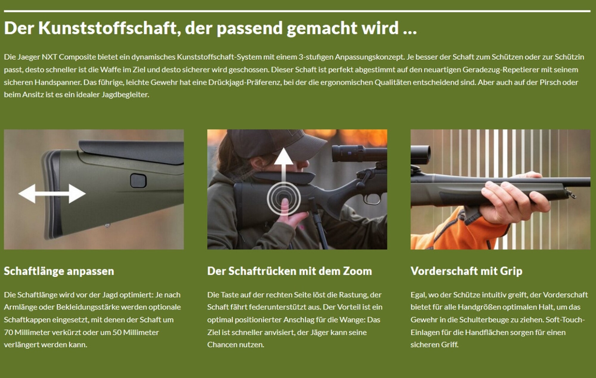 Zusätzlich ist die Jaeger NXT mit soft-touch Einlagen versehen, die extra griffig sind und jeder Wetterlage trotzen. Auch die neue Vorderschaftgeometrie sorgt dafür, dass die Waffe gut zu greifen und aufzulegen ist.