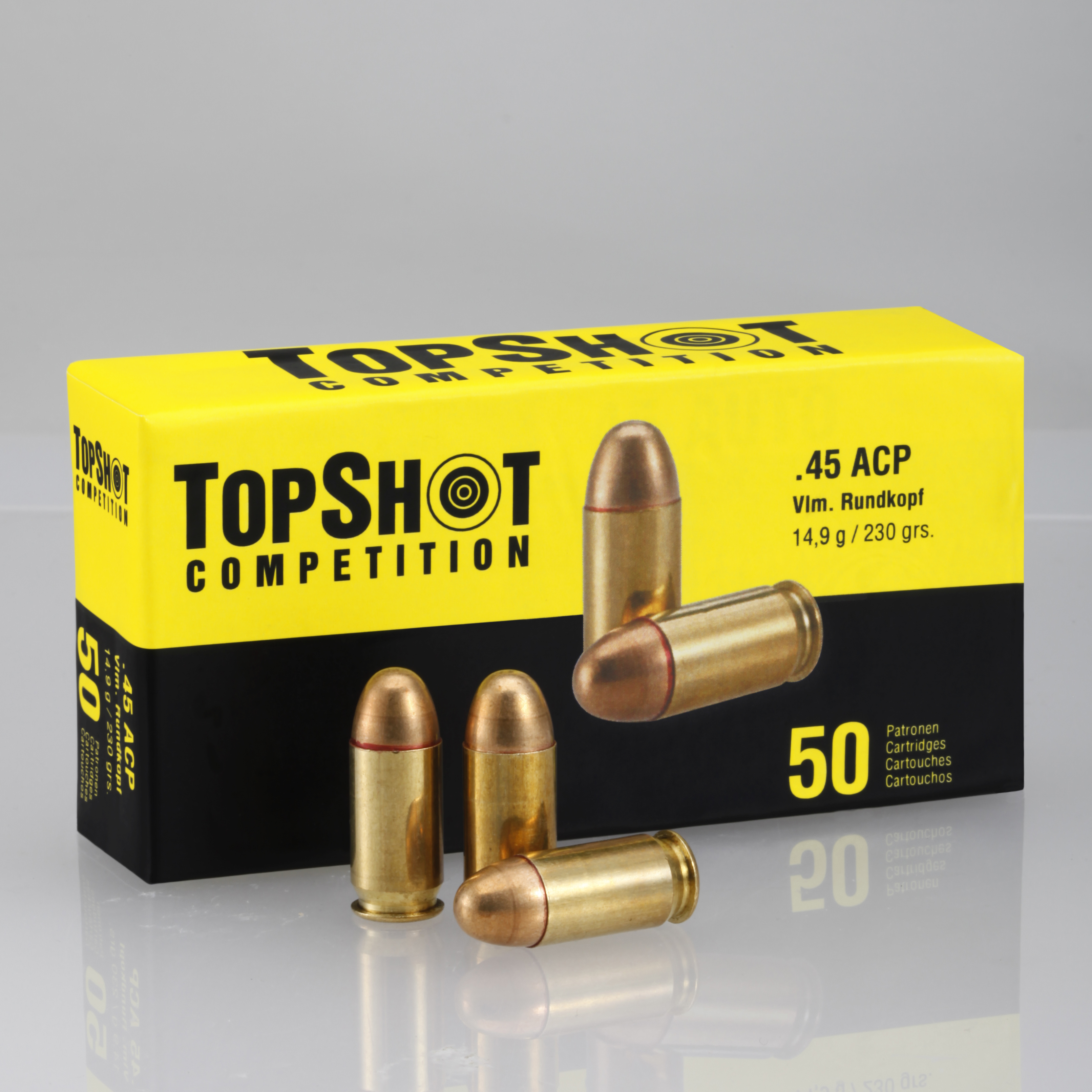 Für Training und Wettkampf: TOPSHOT COMPETITION Kurzwaffenpatrone .45 ACP Vollmantel-Rundkopf, 14,9 g / 230 grs. Erhältlich ab Mai 2012. Preis: 25,00 Euro (50 Stück) |